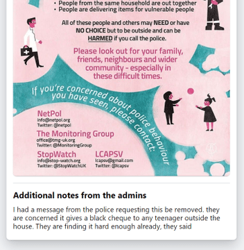 Someone who posted the pink flyer in their local Covid-19 Mutual Aid group in Hertfordshire received a message from the police requesting its removal. An officer said, “There is a line at the bottom about perceived inappropriate police behaviour. As a frontline, local police Sgt, I find this outrageous in these unprecedented and trying times. […] this poster is basically excusing any teenager to be outside, putting everyone at risk, while planting the seed for people to complain about the police“.