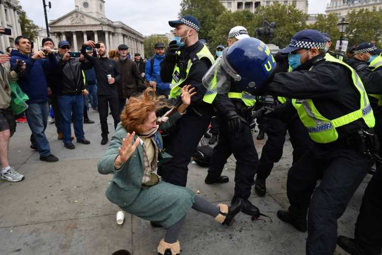 On Saturday 26 September, police in riot gear made 16 arrests as they cracked down on a much larger anti-lockdown protest in Trafalgar Square. This photo by AFP and a video of a woman knocked to the ground were widely circulated on social media: